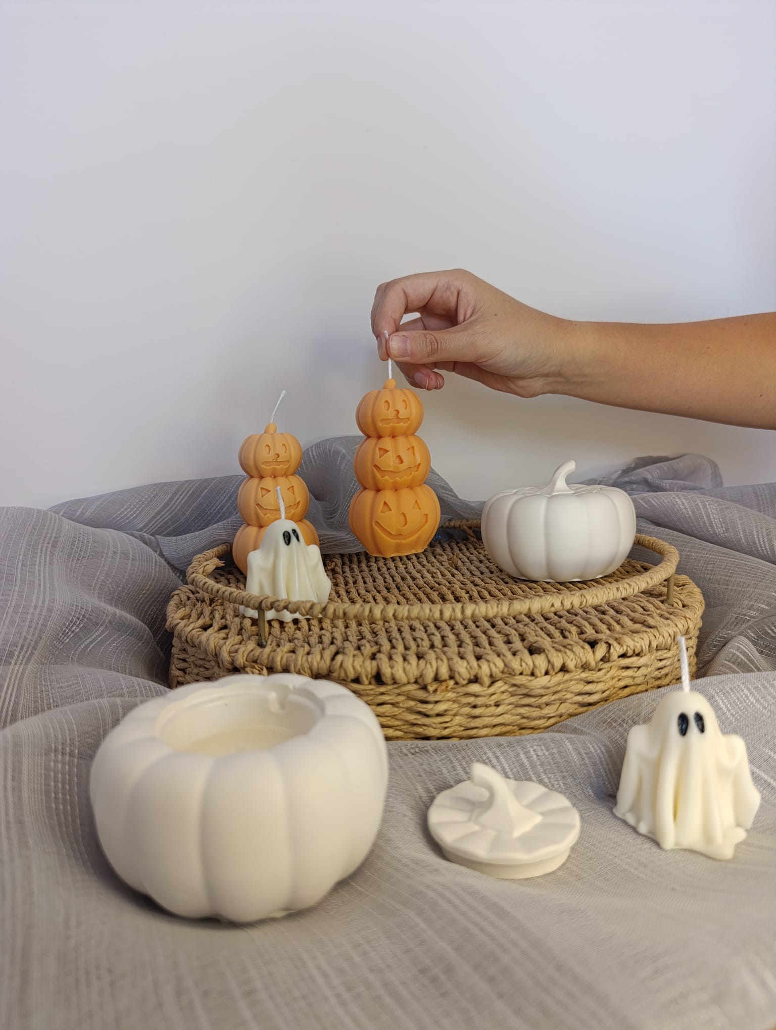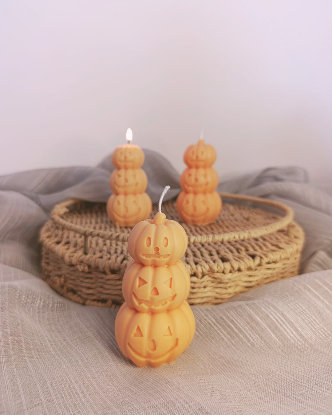 Uma torre encantadora de três abóboras, perfeita para trazer magia e aconchego ao seu cantinho neste Halloween.