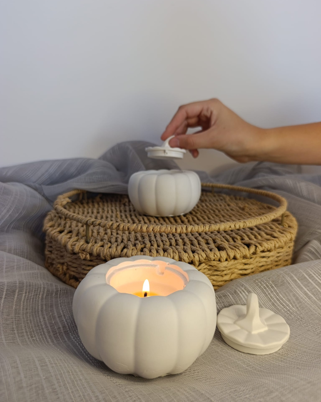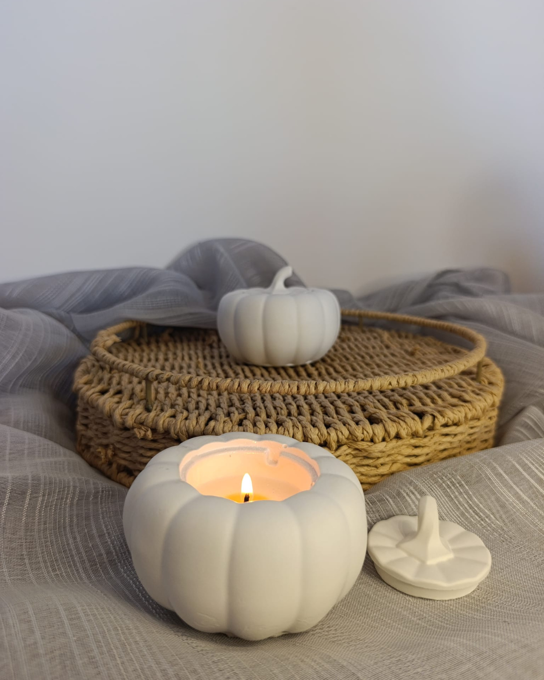 Cada detalhe desta vela foi pensado para encantar. O copo em forma de abóbora é feito à mão em cerâmica, com texturas e acabamentos únicos que tornam cada peça exclusiva.